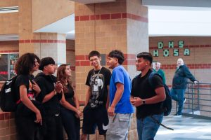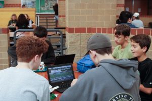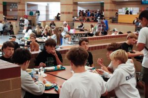 Panthers sitting in the hallway eating lunch.