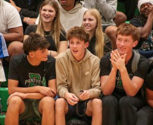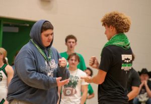 Homecoming candidate’s participate in the pep rally game, pulling on the yellow strings.