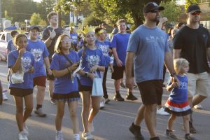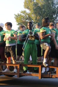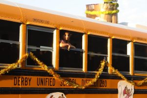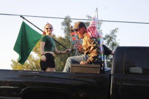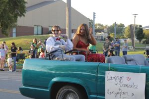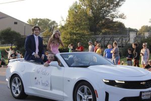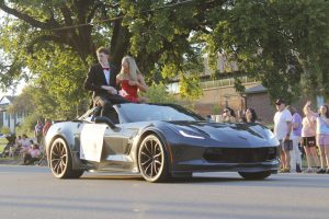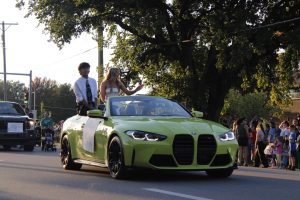 Seniors Dalton Hornback and Ava Becker smile at the parade audience.