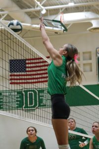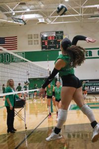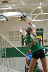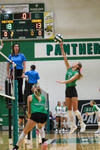 Volleyball player hits the ball.