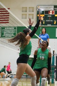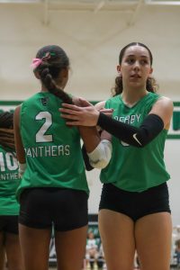 Volleyball player looks back at her teammate.