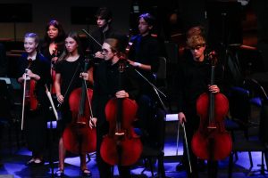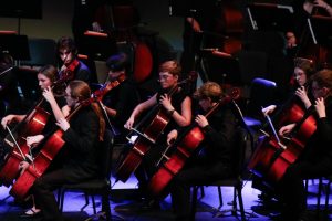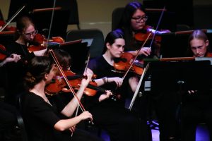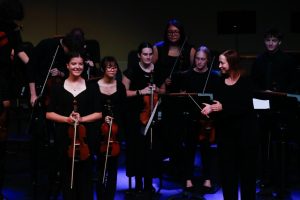 Symphony Orchestra and Director Dr. Amber Peterson stands up and faces the crowd.