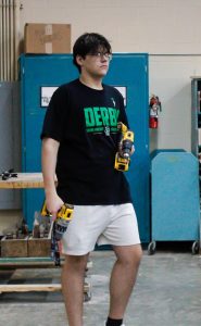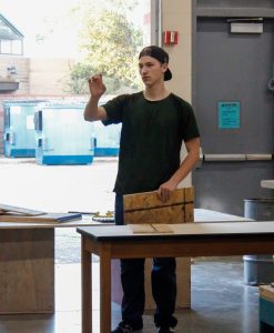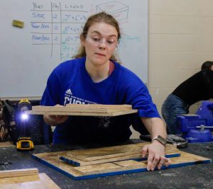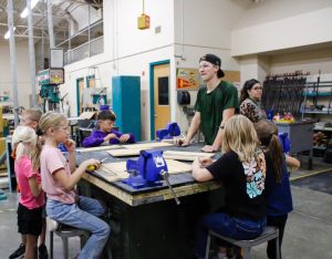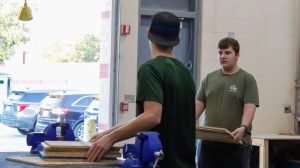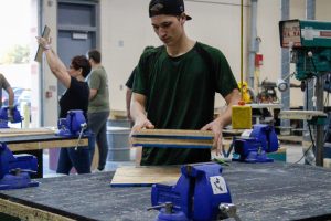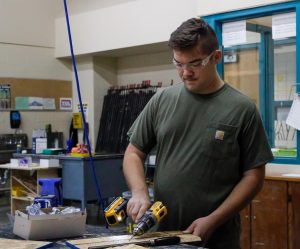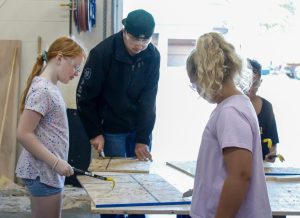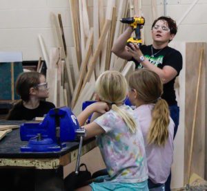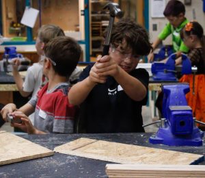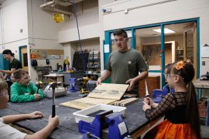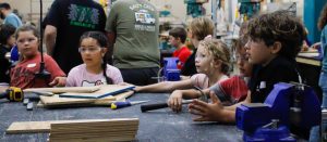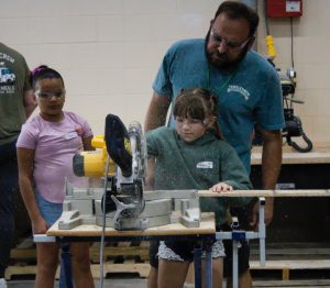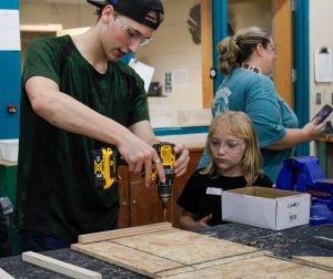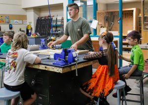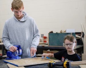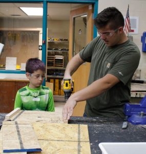 Panther helping a Tanglewood Tiger with the saw.Tanglewood 3rd grade students partnering with Derby High panthersPanther preparing for Tanglewood to come to the shop.Panther drills into the woodPanther places wood downPanther and Tanglewood Tiger listen for the next instructionPanther and Tanglewood Tiger listen for the next instructionPanthers talking
