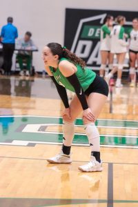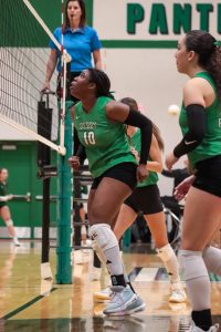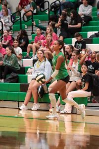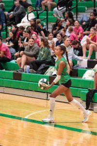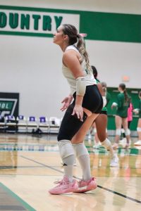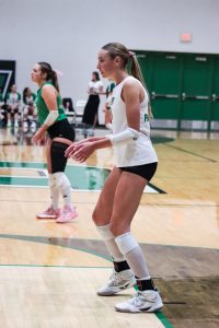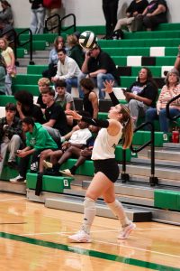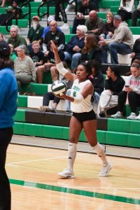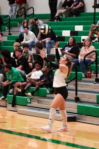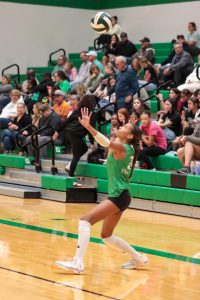 Senior McKinley Sinclair looks up at the ball and puts arms out to bump it.