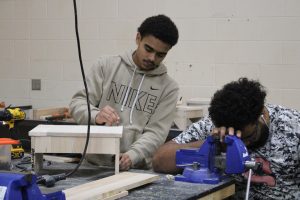 Student uses nails to assemble project.